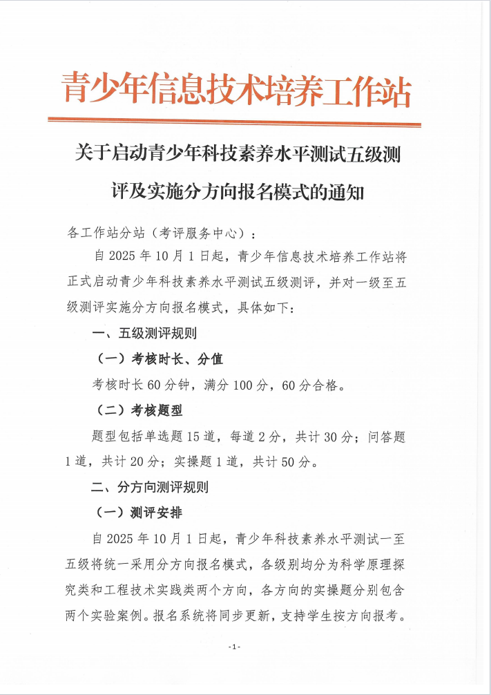 关于启动青少年科技素养水平测试五级测评及实施分方向报名模式的通知